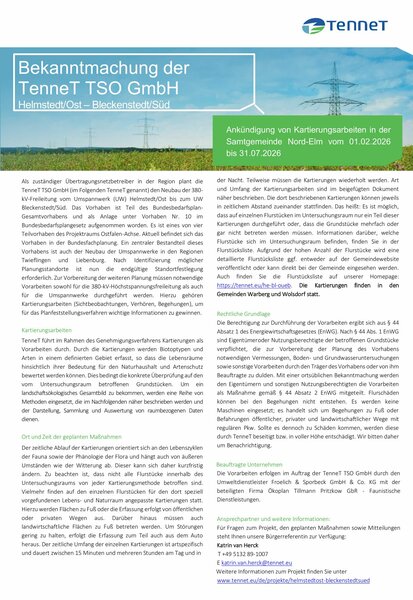 Die Berechtigung zur Durchführung der Vorarbeiten ergibt sich aus § 44 Absatz 1 des Energiewirtschaftsgesetzes (EnWG). Nach § 44 Abs. 1 EnWG sind Eigentümeroder Nutzungsberechtigte der betroffenen Grundstücke verpflichtet, die zur Vorbereitung der Planung des Vorhabens notwendigen Vermessungen, Boden- und Grundwasseruntersuchungen sowie sonstige Vorarbeiten durch den Träger des Vorhabens oder von ihm Beauftragte zu dulden. Mit einer ortsüblichen Bekanntmachung werden den Eigentümern und sonstigen Nutzungsberechtigten die Vorarbeiten als Maßnahme gemäß § 44 Absatz 2 EnWG mitgeteilt. Flurschäden können bei den Begehungen nicht entstehen. Es werden keine Maschinen eingesetzt; es handelt sich um Begehungen zu Fuß oder Befahrungen öffentlicher, privater und landwirtschaftlicher Wege mit regulären Pkw. Sollte es dennoch zu Schäden kommen, werden diese durch TenneT beseitigt bzw. in voller Höhe entschädigt. Wir bitten daher um Benachrichtigung.
