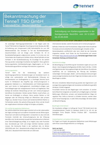 Mit einer ortsüblichen Bekanntmachung werden den Eigentümern und sonstigen Nutzungsberechtigten die Vorarbeiten als Maßnahme gemäß § 44 Absatz 2 EnWG mitgeteilt.