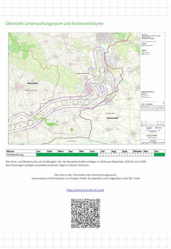 Der zeitliche Ablauf der Kartierungen orientiert sich an den Lebenszyklen der Vögel und hängt auch von äußeren Umständen wie der Witterung ab. Dieser kann sich daher kurzfristig ändern. Zu beachten ist, dass nicht alle Flurstücke innerhalb des Untersuchungsraums bei der Erfassung betroffen sind. Da die konkrete Auswahl der Kartierbereiche im Rahmen einer Übersichtsbegehung erfolgt, ist es möglich, dass viele Flurstücke bzw. Grundstücke gar nicht und einige mehrfach betreten werden müssen. Die Horstsuche findet in der laubfreien Zeit, im Winter 2025/2026 statt. Die 1. Besatzkontrolle erfolgt Ende April / Anfang Mai 2026, die 2. Besatzkontrolle findet Ende Juni 2026 statt.