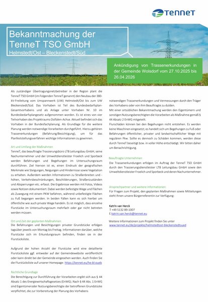 Die Trassenerkundungen erfolgen im Auftrag der TenneT TSO GmbH durch den Trassierungsdienstleister LTB Leitungsbau GmbH sowie den Umweltdienstleister Froelich und Sporbeck und deren Nachunternehmer.