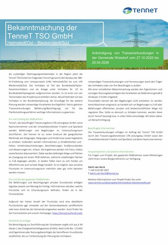 Mit einer ortsüblichen Bekanntmachung werden den Eigentümern und sonstigen Nutzungsberechtigten die Vorarbeiten als Maßnahme gemäß § 44 Absatz 2 EnWG mitgeteilt.