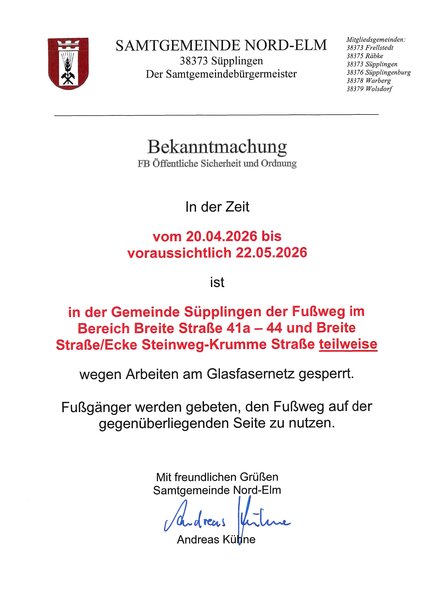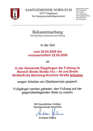 in der Gemeinde Süpplingen der Fußweg im Bereich Breite Straße 41a - 44 und Breite Straße/Ecke Steinweg-Krumme Straße teilweise