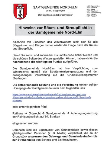 Die Samtgemeinde Nord-Elm hat ihre Verpflichtung zum Winterdienst gemäß der Straßenreinigungssatzung und der dazugehörigen Verordnung auf die Grundstückseigentümer übertragen.