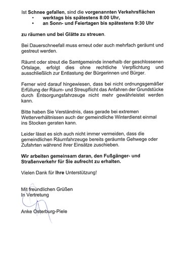 Räumt oder streut die Samtgemeinde innerhalb der geschlossenen Ortslage, erfolgt dies ohne rechtliche Verpflichtung und ausschließlich zur Entlastung der Bürgerinnen und Bürger.