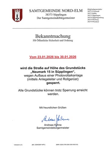 Vom 23.01.2026 bis 30.01.2026 wird die Straße auf Höhe des Grundstücks Neumark 15 in Süpplingen wegen Aufbaus einer Photovoltaikanlage (mittels Anlegeleiter und Rollgerüst) gesperrt.