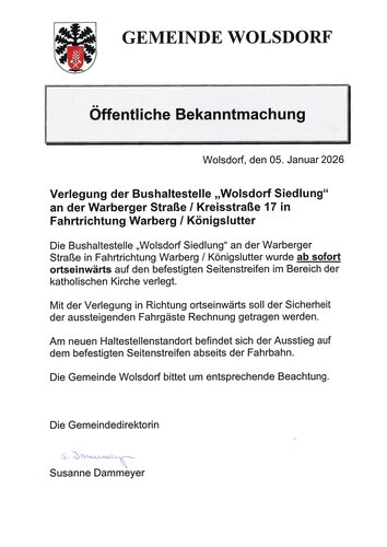 Die Bushaltestelle "Wolsdorfer Siedlung" an der Warberger Straße in Fahrtrichtung Warberg / Königslutter wurde ab sofort ortseinwärts auf den befestigten Seitenstreifen im Bereich der katholischen Kirche verlegt.