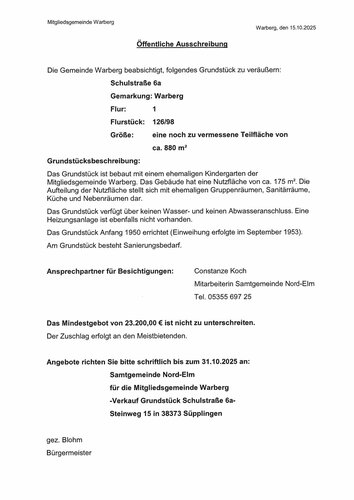 Die Gemeinde Warberg beabsichtigt, folgendes Grundstück zu veräußern: