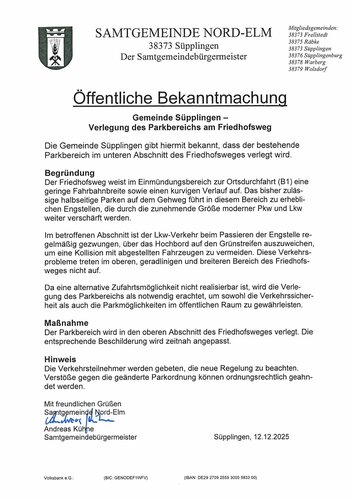 Die Gemeinde Süpplingen gibt hiermit bekannt, dass der bestehende Parkbereich im unteren Abschnitt des Friedhofsweges verlegt wird.