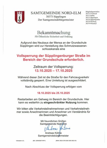Vollsperrung der Süpplingenburger Straße im Bereich der Grundschule erforderlich.