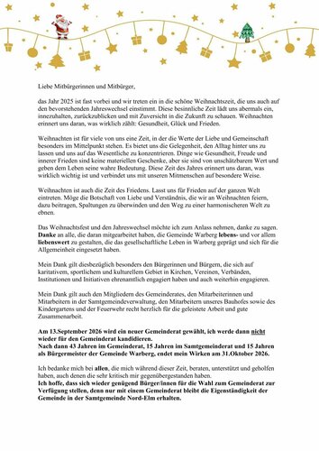 Nach dann 43 Jahren im Gemeinderat, 15 Jahren im Samtgemeinderat und 15 Jahren als Bürgermeister der Gemeinde Warberg, endet mein Wirken am 31. Oktober 2026.