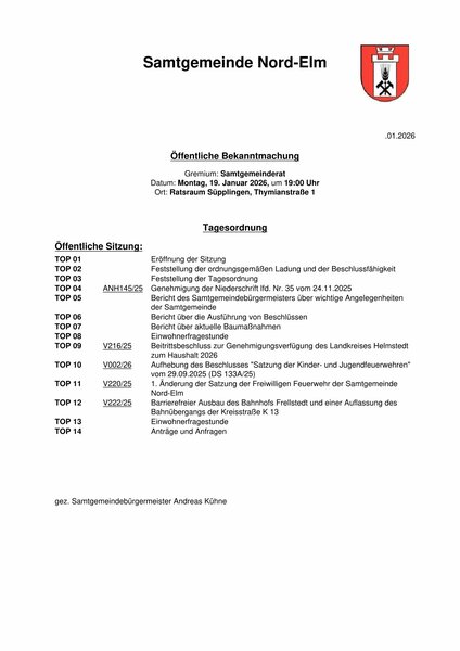 Die Sitzung wird auf Montag, den 19.01.2026, 19:00 Uhr verschoben.