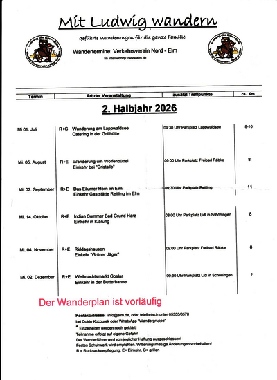 Kontaktadresse: info@elm.de oder telefonisch unter 05355/6578 bei Quido Kocourek oder WhatsApp "Wandergruppe"